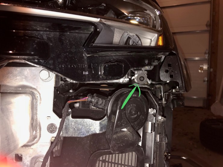 Use an Allen key to remove the sensor, including bracket from the crash bar. The temperature sensor has a pin in the center that can be pushed out, and then pushed through the back-side. Be careful with this, as I did break the bracket (sponsored by Gorilla Glue, now!). STM included a new bracket, which I took the opportunity to mount (T27 again, I believe).