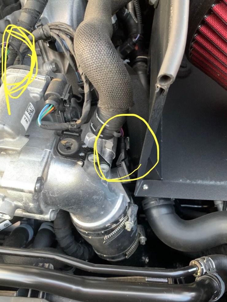 2. Remove your engine cover, and find the two connectors circled in the photo below.