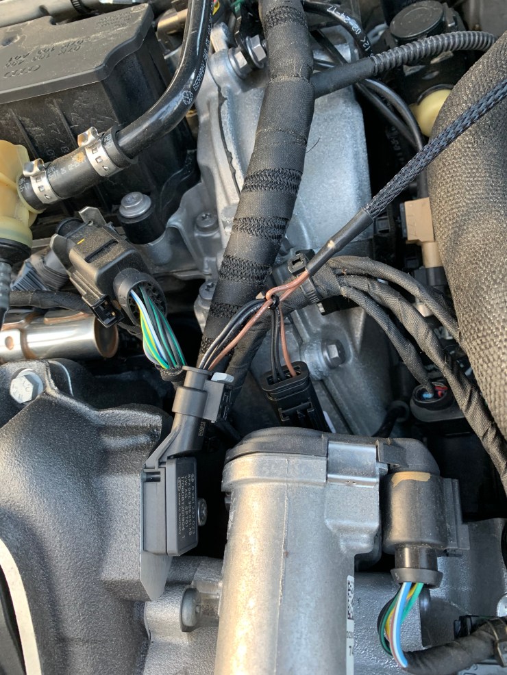 Special note – you won’t use one of the connectors – this goes to the fuel rail. Per George @ Burger, this is a terribly inconvenient plug to get to on the RS3, so they are working up a better solution. Zip tie it back into a nice location and out of the way at the end of the installation, you won’t use it for the Alpha version of the JB4.
